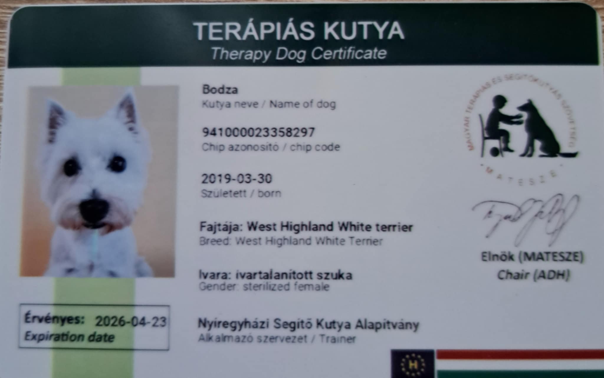 Hívő emberként Isten ajándékának tartom, hogy Bodza nevű kutyámnak gazdája lehetek. Úgy érzem szándéka volt vele, hogy számomra egy ismeretlen világot, egy új szemléletre vezessen az életembe. Akkor még nem is sejtettem, mennyi mindent fogunk egymásnak adni, tanulni az önzetlen szeretetről, az odaadásról, kötődésről, a meglévő és ,,rejtett” képeségeink és kompetenciáink felszínre hozataláról és fejlesztéséről. Bodza egy igazi energiabomba. Kedves, nagyon játékos, szeretetreméltó és imádja a gyerekeket. Rendkívül érdeklődő, mindenre figyel, ami a környezetében zajlik. Vidámsága miatt a terápiás foglalkozások mindig jó hangulatba telnek.